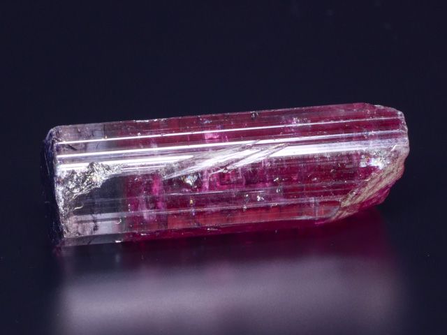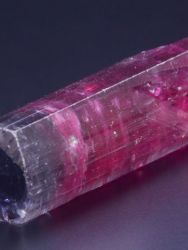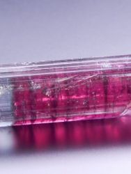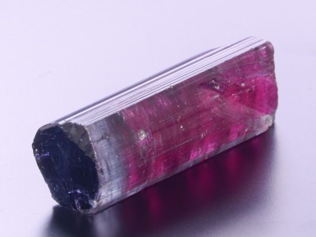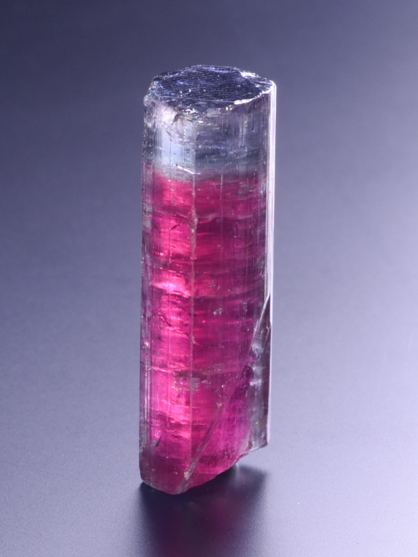 Ukončený krystal elbaitu z významné brazilské lokality Cruzeiro mine. Krystal má jedinečnou světle malinovou barvu v centrální části krystalu, přecházející do zelenomodré barvy na povrchu krystalu (tzv. vodní meloun). Krystal má drobné poškození na jedné hraně prizmatu těsně pod ukončením. Barva kamene je ve skutečnosti mírně tmavší barvy - toto je způsobeno nasvícením ve studiovém prostředí.