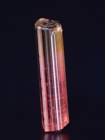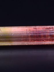 Krásný neukončený krystal turmalínu z ruské lokality Vodorazhdelnoye. Jedná se o turmalín elbaitové řady z pegmatitů Sibiře. Lesklý krystal bez poškození - pouze prizma. Krystal má světle zelenožlutou barvu v jedné třetině, zbylá část krystalu má různé odstíny růžové barvy. Čistota kamene by v celém objemu (100,00%) splňovala kvality top suroviny na broušení.
