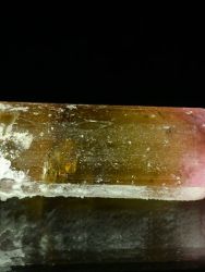 A very nice example of the tourmaline variety elbaite from a find in 2012. This one is almost pristine and has glassy lustre. Other tourmalines are pink, but few are this pink/yellow. It is complete all around, and very symmetrical.