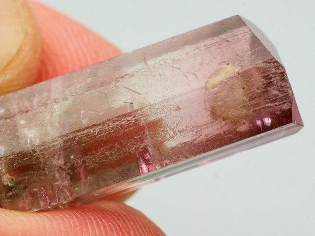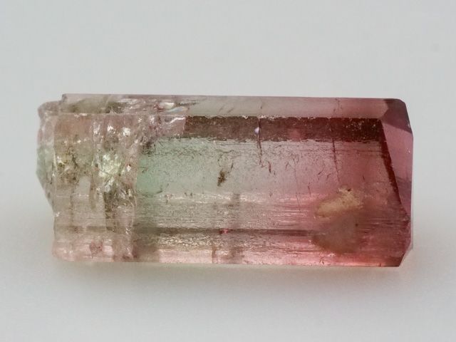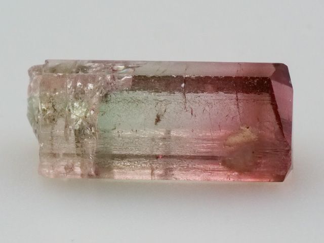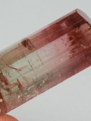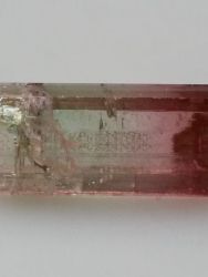 A tourmaline from Siberia with very attractive coloration - raspberry/pink (upper part) and green/blue (lower part).A tourmaline from Siberia with very attractive coloration - raspberry/pink (upper part) and green/blue (lower part). The termination has less luster and it is in very good condition. The interior is partially gemmy.
