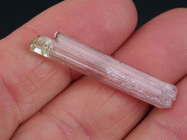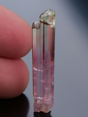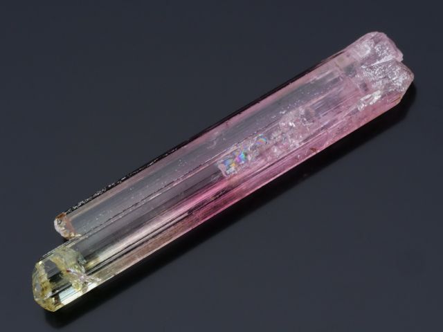 A gorgeous, gemmy and lustrous, tourmaline crystal, perfectly terminated. Base red to pink passing with different colors a light yellow/green to the top.