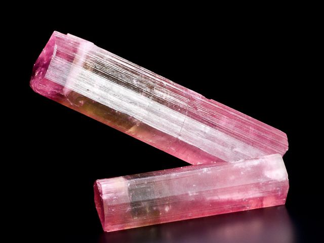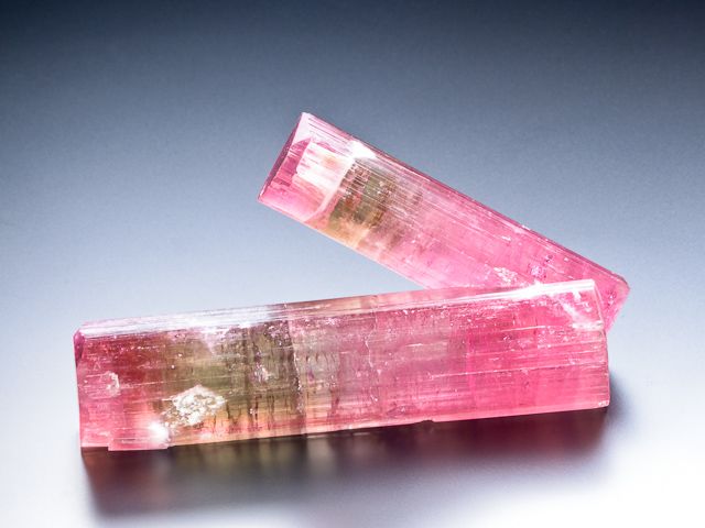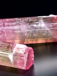 This is an extra Tourmaline specimen from Himalaya Mine, Mesa Grande, San Diego Co., California, USA.This is an extra Tourmaline from Himalaya Mine, Mesa Grande, San Diego Co., California, USA. Big elbaites crystal, developed in a "V" shape. A fine cluster, with top color and luster, and good symmetry. The bigger crystal is repaired twice. Small chipping is present along the lower part, but it is in fact small in context. Comes with custom-made acrylic base!