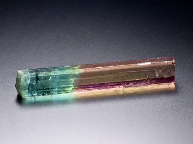 A beautiful, gemmy, polychrome tourmaline from the Cruzeiro Mine of Brazil. The lower portion is a beautiful rose-red, an uncommon color for Brazilian tourmalines and grades upward to green, to teal-blue, to dark green. Cruzeiro tourmalines of this color and quality came out in the 1960s and 1970s.