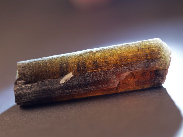 A tourmaline from Siberia with very attractive coloration - green/brown. The termination has less luster and it is in very good condition. The interior is partially gemmy.