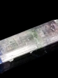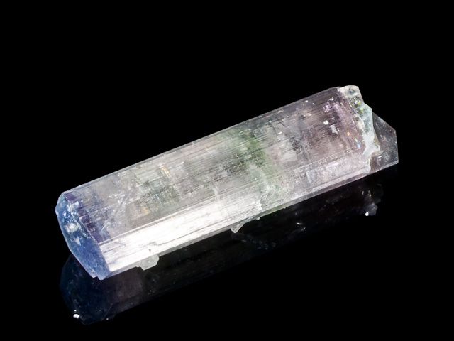 Here's a beautiful specimen of multi-color elbaite tourmaline that is green for most of its length, then changes to white and blue/violet on the termination. All sides of the crystal are deeply striated and lustrous. The crystal faces are clean and in good condition.