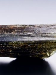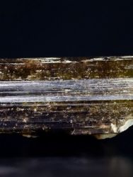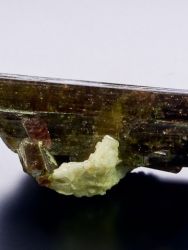 Ukončený krystal elbaitu z famózní lokality Malkhan. Jedná se o turmalín elbaitové řady z pegmatitů Sibiře. Lesklý ukončený krystal bez poškození. Krystal má hnědožlutou barvu (uvnitř krystalu) s občasnými šmouhami růžovočervené barvy na některých hranách. Barevný odstín je bez nasvícení více tmavý. Na boku drobná albitová podložka.