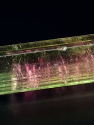Ukončený krystal elbaitu z významné brazilské lokality Cruzeiro mine.Ukončený krystal elbaitu z významné brazilské lokality Cruzeiro mine. Krystal má jedinečnou světle malinovou barvu v centrální části krystalu, přecházející do zelenomodré barvy na povrchu krystalu (tzv. vodní meloun). Krystal není výrazně poškozen - jen velmi drobné oděrky z těžby. Barva kamene je ve skutečnosti mírně tmavší barvy - toto je způsobeno nasvícením ve studiovém prostředí.