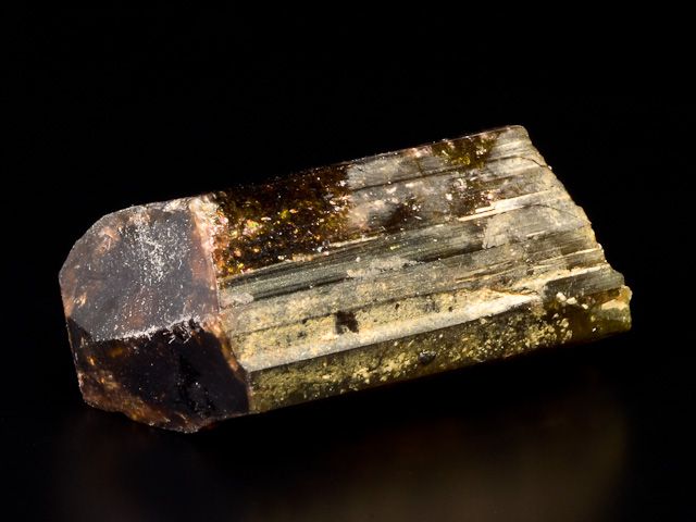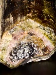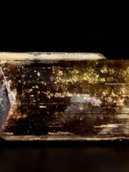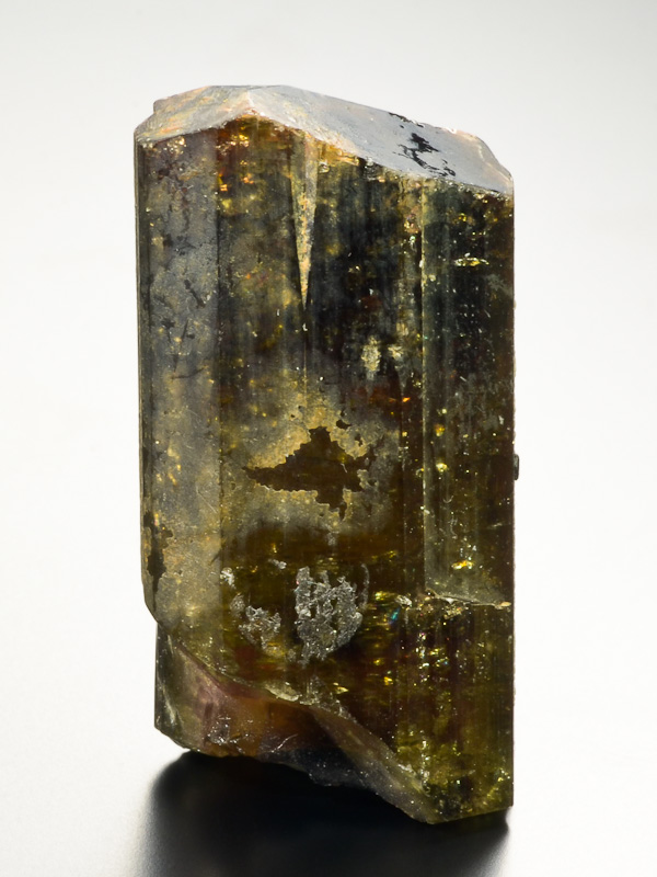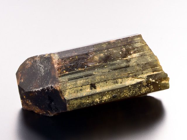 Ukončený krystal elbaitu z famózní lokality Malkhan. Jedná se o turmalín elbaitové řady z pegmatitů Sibiře. Lesklý ukončený krystal bez poškození. Krystal má světle růžovou barvu (uvnitř krystalu) se zelenohnědými okraji (tzv. vodní meloun) a jeho čistota by splňovala kvality top suroviny na broušení tzv. ruské "kabošonky" či placiček do šperků.