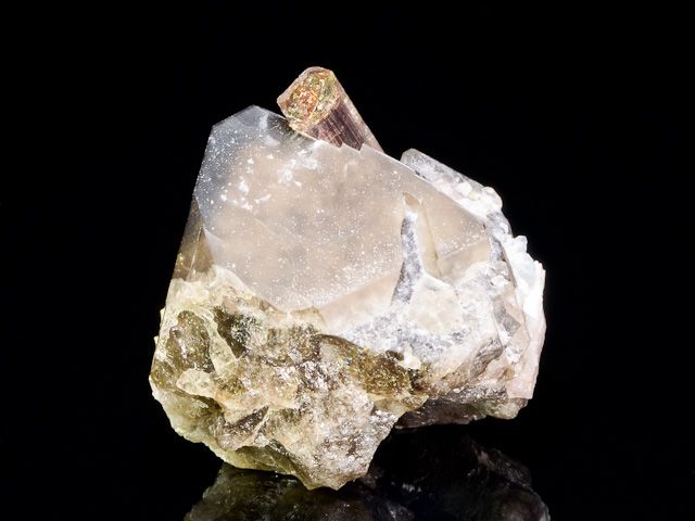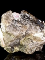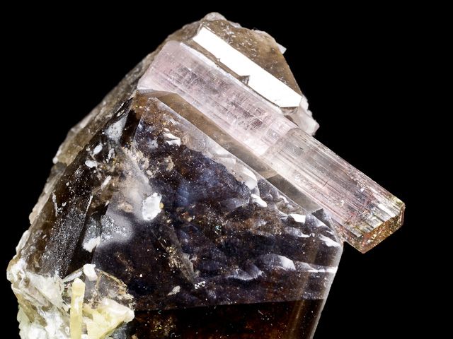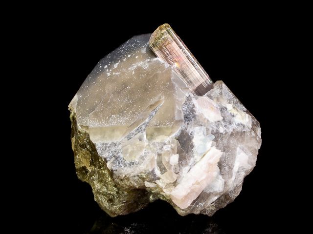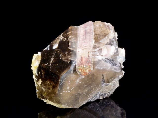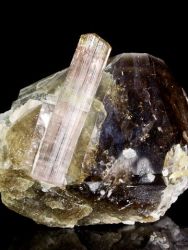 Here is a beautiful specimen of multi-color elbaite tourmaline on smoky quartz.Here's a beautiful specimen of multi-color elbaite tourmaline that is pink/green for most of its length, then changes to green on the termination. All sides of the crystal are deeply striated and lustrous. The crystal faces are clean and in good condition.