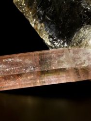 Ukončený vícebarevný turmalín z tadžické lokality Malysha Mine. Kvalitativně jsou tyto kameny celosvětově ceněné. Jedná se o lesklý kámen s krystalem (částí krystalu) záhnědy po straně. Krystal turmalínu je lesklý, ukončený a velmi esteticky rostlý. Krystal byl odlomen a po nalezení opraven - odborně slepen v části spodní třetiny krystalu. Zajímavý kámen z netradiční lokality.