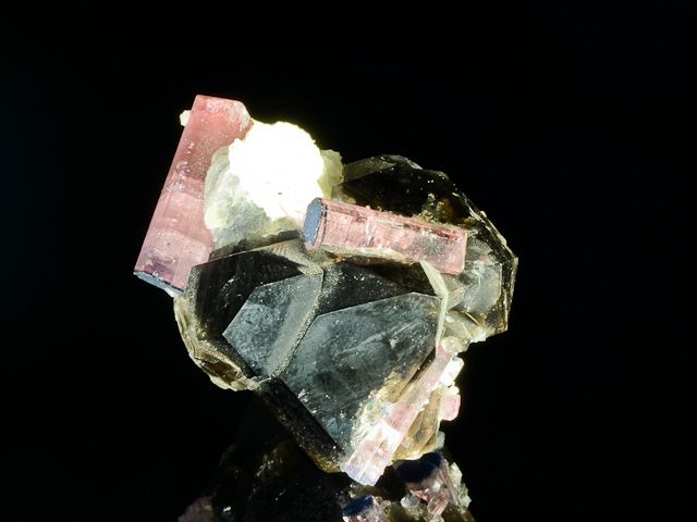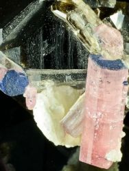 Kvalitní ukázka několika rubelitů tzv. blue cap narostlých na oboustranně ukončených krystalech morionu.Kvalitní ukázka několika rubelitů tzv. "blue cap" narostlých na oboustranně ukončených krystalech morionu. Turmalíny mají ukončení porostlé modrofialovou vrstvičkou turmalínu, které vytváří po prosvícení úžasný průsvitový efekt. Největší turmalín dosahuje velikosti 17 mm. Na drúze se vyskytuje i několik krystalů lepidolitu a albitu. Malý ale luxusní vzorek.