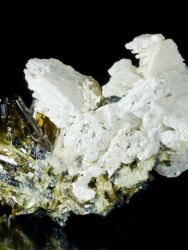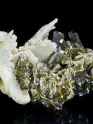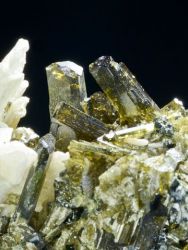 Drúza krystalů epidotu z pakistánské lokality Alchuri. Krystaly jsou převážně ukončené, lesklé a průsvitné. Epidoty vyrůstají z drobné albitové podložky. Největší krystal epidotu měří 21 mm.