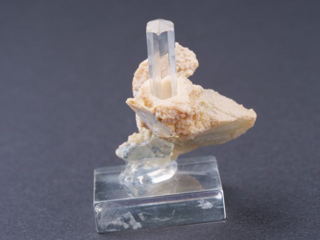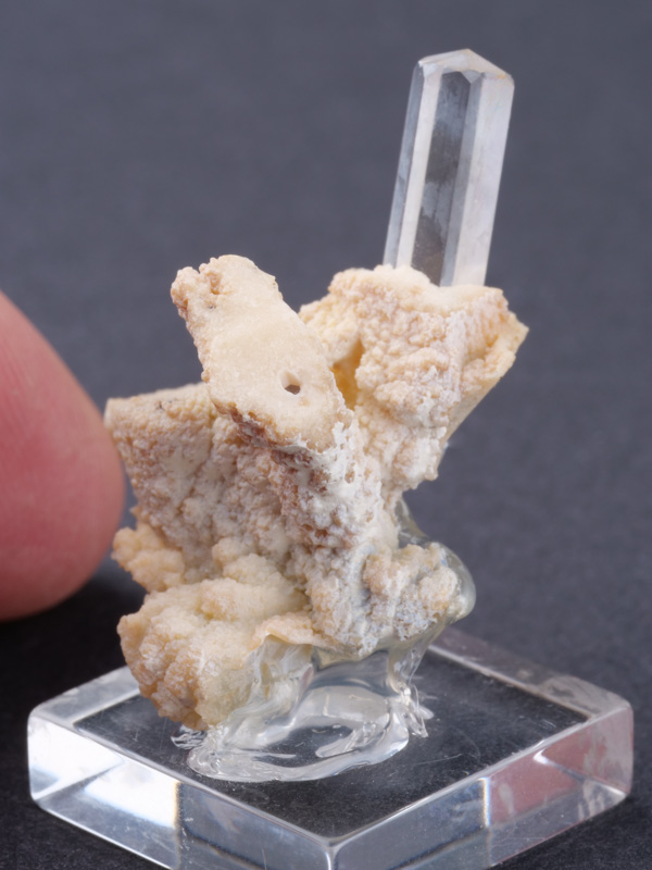 Estetická a charizmatická ukázka čirého krystalu fenakitu vyrůstajícího z drobných živců.Estetická a charizmatická ukázka čirého krystalu fenakitu vyrůstajícího z drobných živců. 1.2 x 0.5 x 0.45 cm velký ukončený krystal fenakitu má dokonalé ukončení a vynikající čistotu. Jedná se o absolutně nepoškozený vzorek, který svojí kvalitou převyšuje většinu vzorků této lokality. Aktuálně na podstavci - je součástí položky.