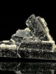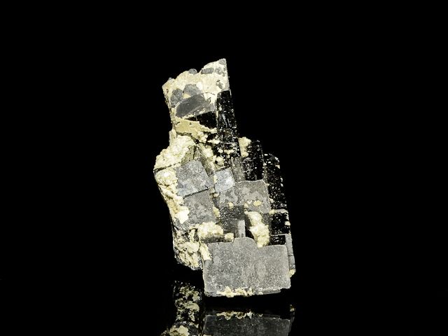 Superb specimen of large prismatic black ferberite crystals with beveled terminations and striated crystal faces.Superb specimen of large prismatic black ferberite crystals with beveled terminations and striated crystal faces. Minor brown siderite crystals are scattered on the rear and the side. Must see in person to appreciate. Ex. A. Martaud collection.