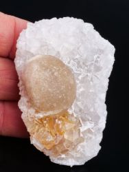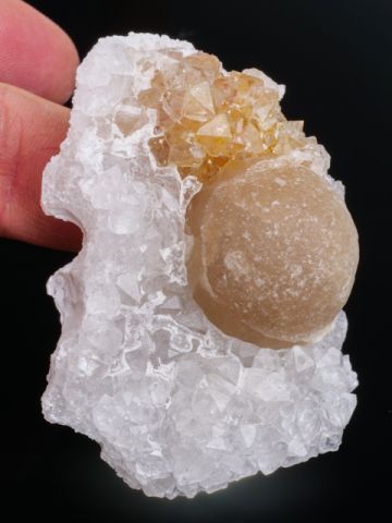On a matrix of drusy, quartz, is botryoids of lemony - tan color fluorite. The hemisphere of fluorite measures 2.6 cm across. The luster is muted but the fluorite is translucent and the color is outstanding. There is no doubt in my mind that this habit is best seen in Indian fluorites, and botryoidal fluorite in general is quite rare in nature.