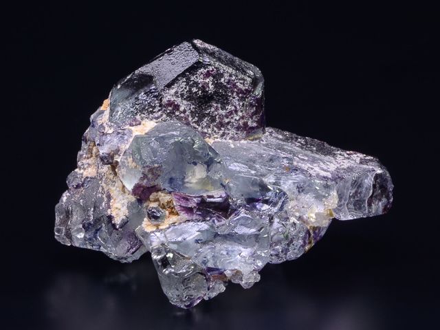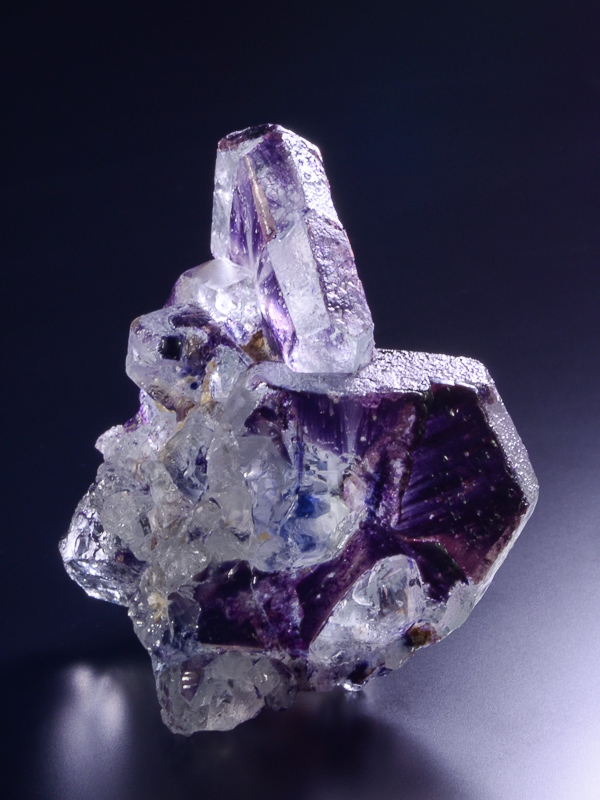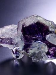 Here we see spinel-twins of pale blue fluorite with purple edges. The locality is the Erongo Massif, Erongo Region, Namibia. The edge of the second main crystal has one ding.