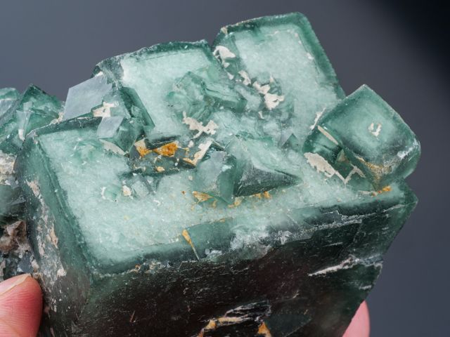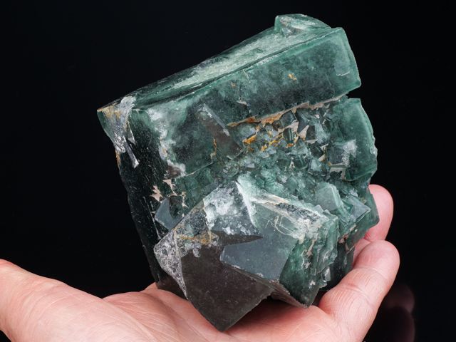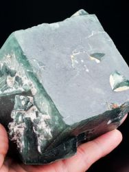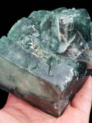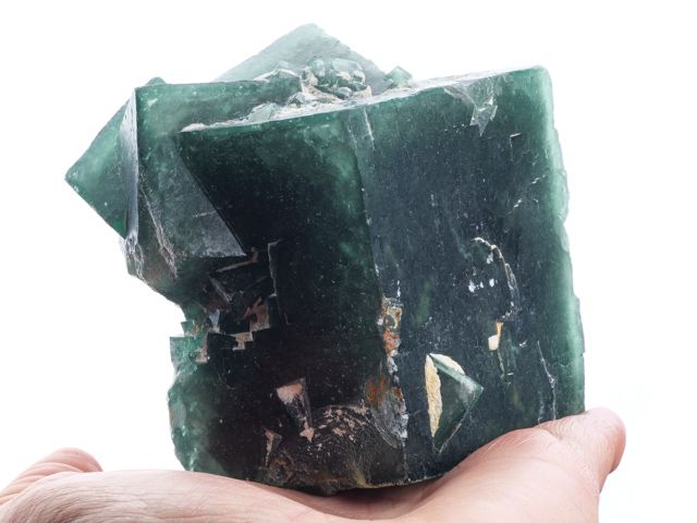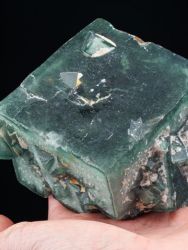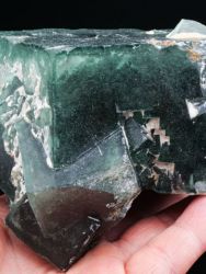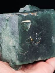 Velký dekorativní či muzeální vzorek - floater - drúza krystalů sytě zeleného fluoritu z Madagaskaru.Velký dekorativní či muzeální vzorek - floater - drúza krystalů sytě zeleného fluoritu z Madagaskaru. Povrch hlavního krystalu je místy porostlý lesklými, různě velkými a nestejnoměrně vybarvenými fluoritovými krystaly. Některé, především ty drobnější, jsou zelenavě čiré a velmi dobře průsvitné. Větší krystaly jsou až temně zelené. Hrana hlavního krystalu měří 7,4 cm. Vzorek je v dobrém stavu - drobná setření na vzorku jsou, ale vzhledem k velikosti je to spíše marginální.