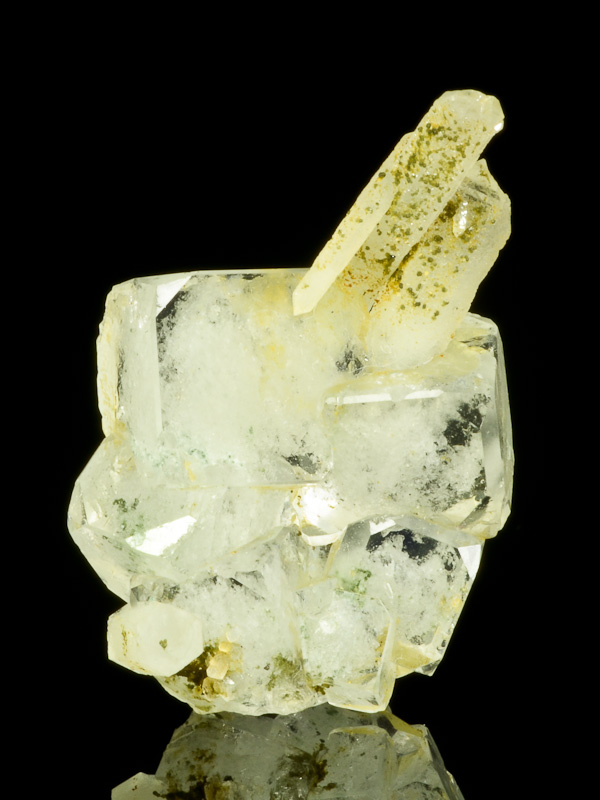 Transparent colorless fluorite crystals to 12 mm with tapered brown quartz crystals to 19 mm.Transparent colorless fluorite crystals to 12 mm with tapered brown quartz crystals to 19 mm. The fluorite crystals are cubic form, with lustrous cubic faces. No damage.