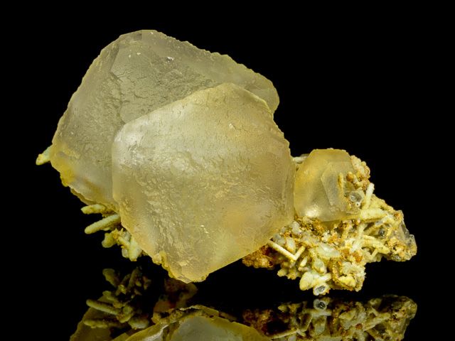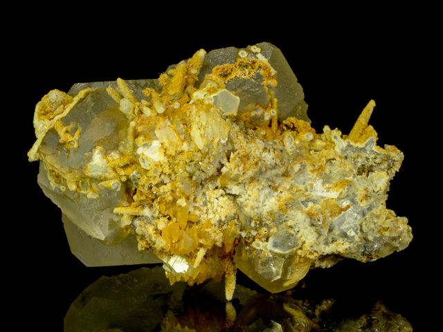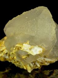 Transparent colorless fluorite crystals with tapered brown quartz crystals and small calcite crystals.Transparent colorless fluorite crystals to 47 mm with tapered brown quartz crystals to 19 mm and small calcite crystals. In pristine condition.