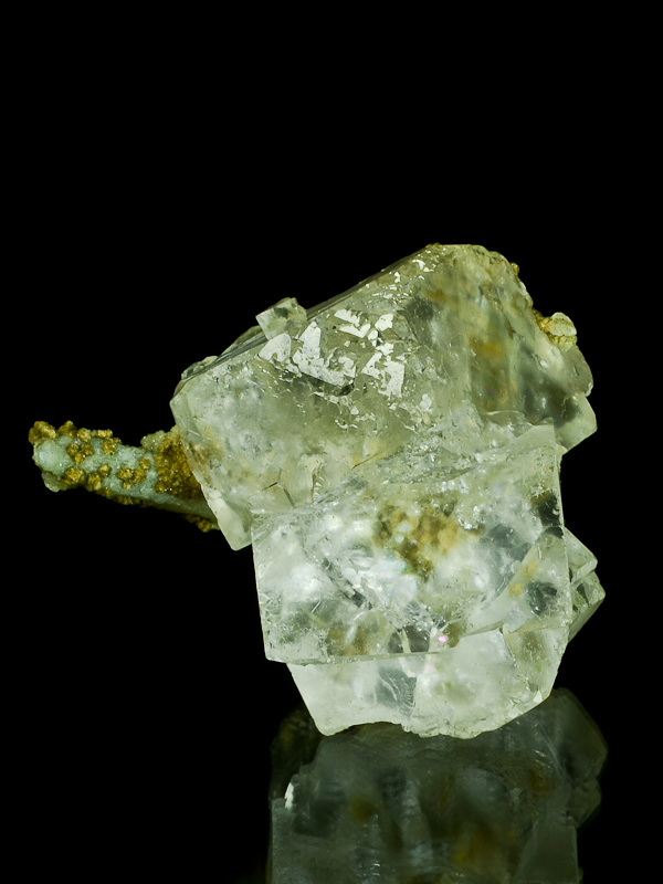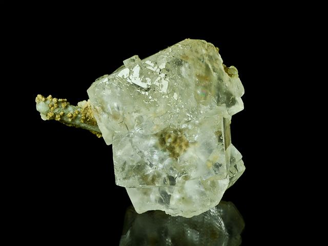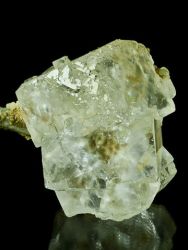 Transparent colorless fluorite crystals with tapered brown quartz crystals, small calcite crystals and brown limonite.Transparent colorless fluorite crystals to 34 mm with tapered brown quartz crystals to 33 mm, small calcite crystals and brown limonite. The fluorite crystals are cubic form, with lustrous cubic faces.