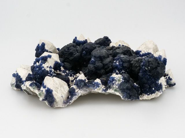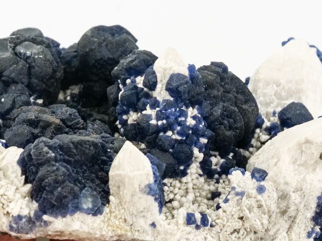 Fluorit tvoří tmavě modré, mastně až skelně lesklé, průsvitné, kubické a dipyramidální krystaly a srostlice dosahující velikosti až 25 mm, které narůstají na mléčně bílé, neprůsvitné křemeny. Vzorek není vzácně ve spodní části formátovaný podříznutím, jak tomu bývá převážně u těchto čínských vzorků. Jeden z nejlepších vzorků co jsme kdy z této lokality viděli.