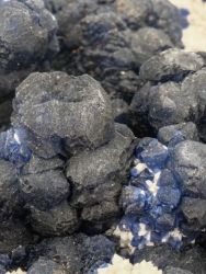 Fluorit tvoří tmavě modré, mastně až skelně lesklé, průsvitné, kubické a dipyramidální krystaly a srostlice na křemenné podložce.
