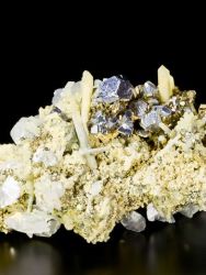 Velice estetická drúza na níž dominují ježaté krystaly křišťálu, lesklé krystaly galenitu, zlatavého pyrhotinu a chalkopyritu.Velice estetická drúza na níž dominují ježaté krystaly křišťálu, lesklé krystaly galenitu, zlatavého pyrhotinu a chalkopyritu. Vzorek doplňují drobné krystaly čirého kalcitu (do 11 mm). Většina krystalů na ježatém vzorku je ukončená. Největší krystal křemene/křišťálu měří 1,4 cm, největší pyrhotin měří 5 mm.