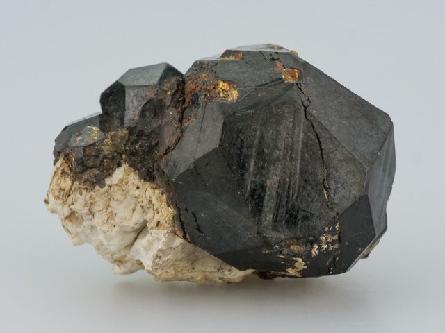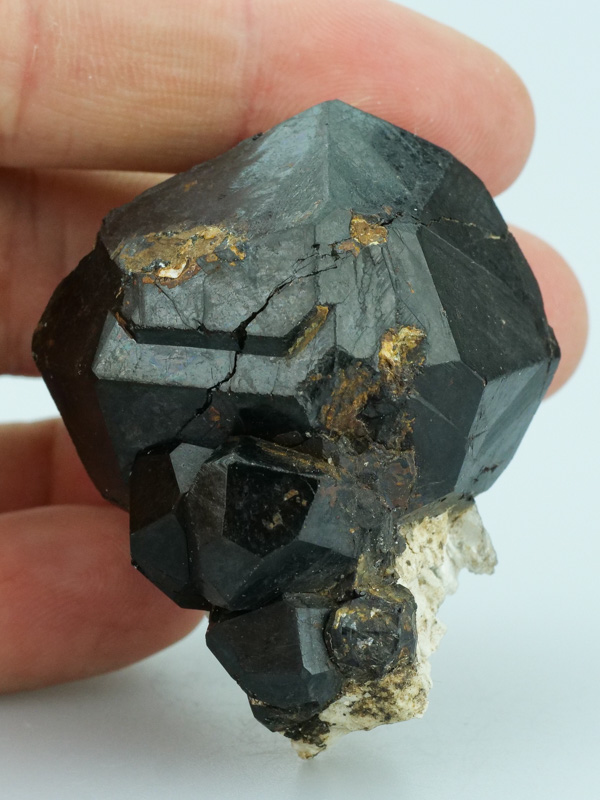Trapezohedral black almandine-spessartine garnet crystals with flat crystal faces on small matrix.Trapezohedral black almandine-spessartine garnet crystals with flat crystal faces on small matrix. Nice crystal from Madagascar.