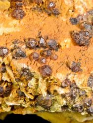 Nadstandardní vzorek draselného živce na který bohatě narůstají dokonalé krystaly granátu.Nadstandardní vzorek draselného živce na který bohatě narůstají dokonalé krystaly granátu almandin spessartinového složení o velikosti do 3 mm spolu s několika krystaly slídy. Vzorek pochází z nálezu v roce 2005.