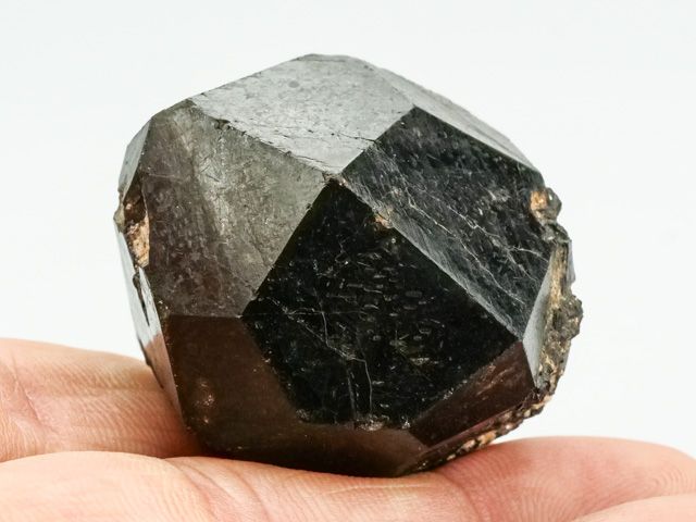 Granát vytváří temně červený (jevící se až černě), neprůsvitný, pěkně ohraničený krystal.Granát (Spessartin/Almandin) vytváří temně červený (jevící se až černě), neprůsvitný, pěkně ohraničený krystal dosahující velikosti 36 mm. Pěkný kámen z Madagaskaru.