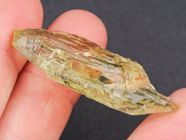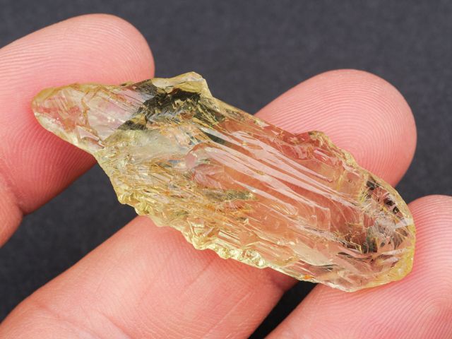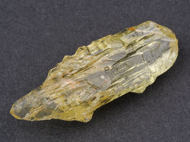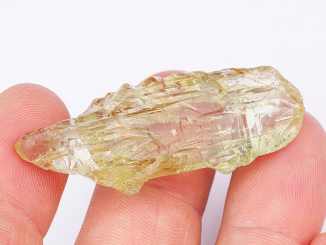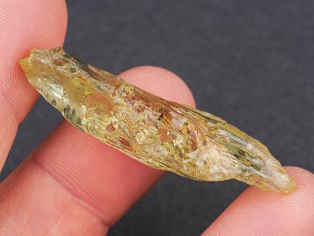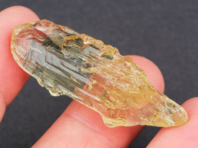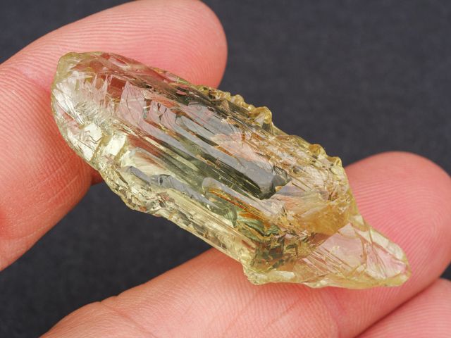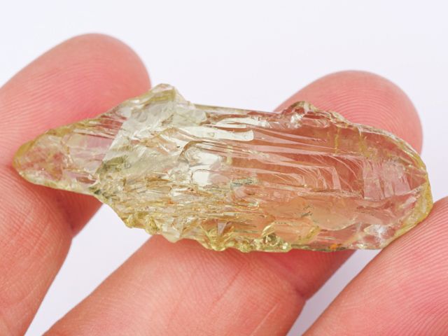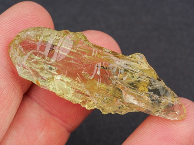 Oboustranně ukončený krystal heliodoru z jedinečné lokality Volyň. Nepoškozený lesklý krystal s typickým leptáním je v gemy kvalitě. Velice estetický vzorek málo častého minerálu ze staré a klasické evropské lokality.