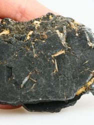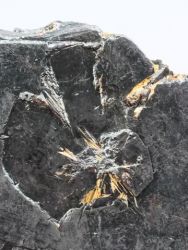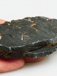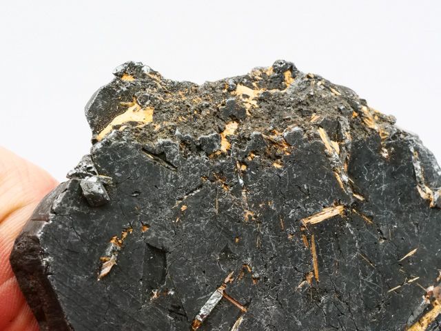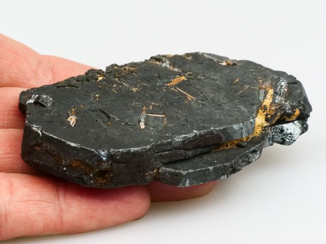 Rutil tvoří menší slámově žluté, zlatavé, kovově lesklé, jehlicovité krystaly, které zarůstají na tabulkovitý, šedočerný, kovově lesklý krystal hematitu.Rutil tvoří menší slámově žluté, zlatavé, kovově lesklé, jehlicovité krystaly dosahující velikosti až 8 mm, které zarůstají na tabulkovitý, šedočerný, kovově lesklý krystal hematitu. Oboustranný vzorek. Několik odřených částí hematitu.