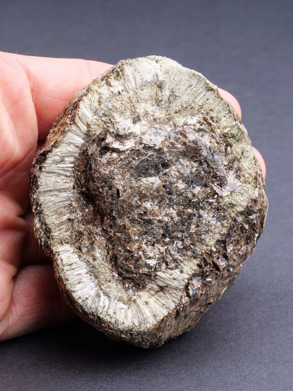 These are cut nodules with a fibrous radiating outer rim consisting of anthophyllite and a flattened phlogopite core. The outer rim is coated with more phlogopite.