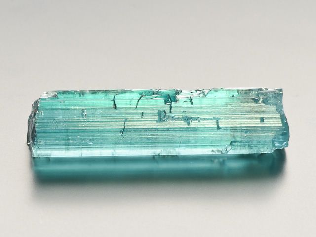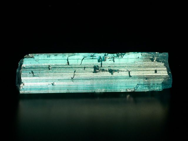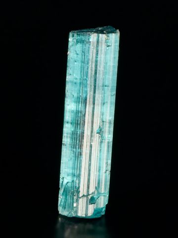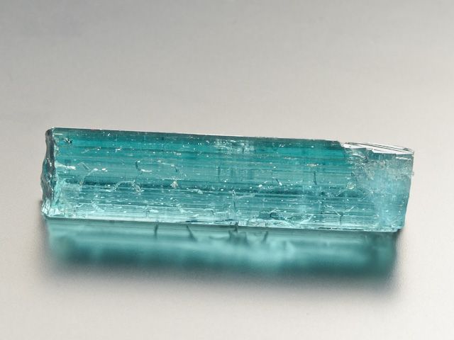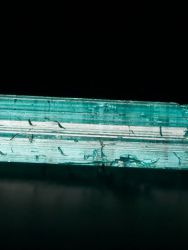 Krásně barevný krystal indigolitu z lokality Taquaral. Lesklý neukončený krystal. Krystal má jedinečnou modrou barvu (odlišnou od nasvícení, bez nasvícení není krystal tak zářivý jako na fotografiích) a jeho čistota by místně splňovala kvality suroviny na broušení. Malý krystal, který může zdobit vaši sbírku či krk.