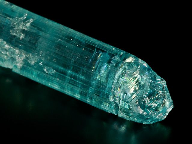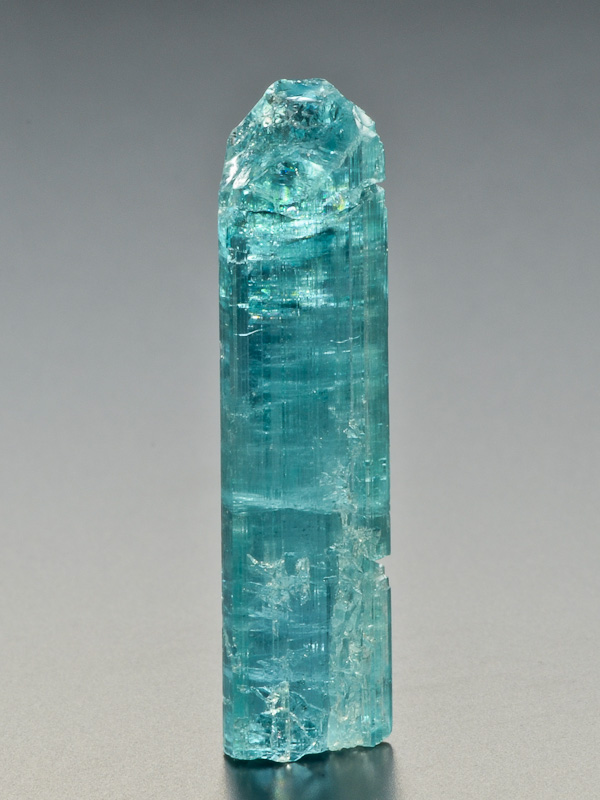 Krásně barevný krystal indigolitu z lokality Taquaral. Lesklý ukončený krystal. Krystal má jedinečnou světle modrou barvu a jeho čistota by místně splňovala kvality suroviny na broušení. Malý krystal, který může zdobit vaši sbírku.
