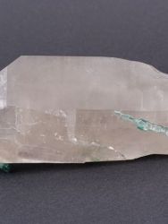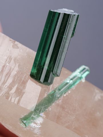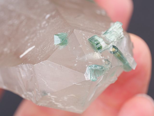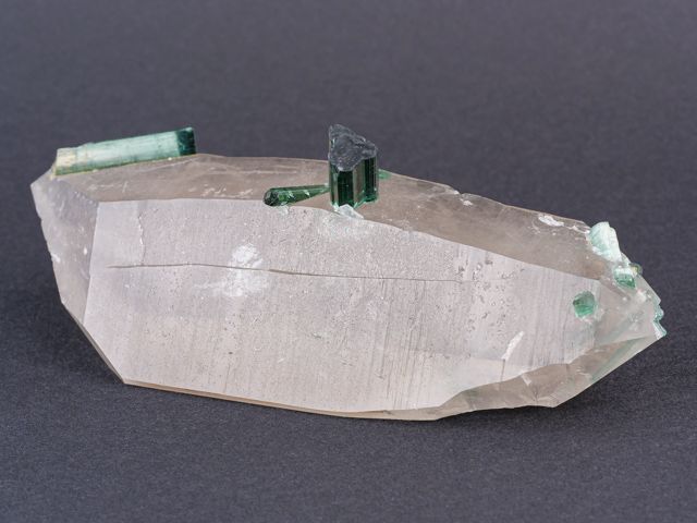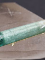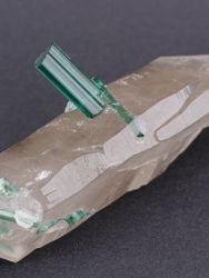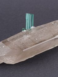 Exkluzivní vzorek světle zelenomodrých krystalů turmalínu na podložce tvořené oboustranně ukončeným krystalem záhnědy.Exkluzivní vzorek světle zelenomodrých krystalů turmalínu na podložce tvořené oboustranně ukončeným krystalem záhnědy. Krystal záhnědy měří v nejdelším směru 13.1 cm, na stranách prizmatu je velice lesklý a čistý se světle kouřovou barvou. Nejdelší krystal turmalínu je ukončený a dosahuje velikosti 2.9 cm. U některých krystalů turmalínu je vidět "vyžrané" jádro, kdy krystal zůstal dutý. Objemově nejvýraznější krystal zarůstá ukončením do záhnědy. Kamenů jako je tento je opravdu minimum - kvalitní barevné turmalíny na podložce jsou světově velmi ceněné.