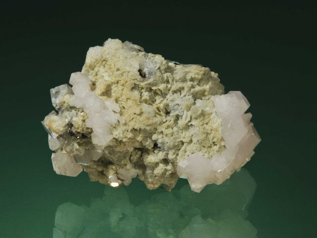 Drúza drobných čirých fluoritů, krystalů tmavého sfaleritu a růžového manganokalcitu.Úžasná drúza kdy na podložku narůstají drobné krychle čirého fluoritu, krystaly tmavého sfaleritu a růžového manganokalcitu. Největší krystal manganokalcitu měří 2,8 cm a je hedvábně lesklý. Krystaly fluoritu dosahují až 1,0 cm na hraně.