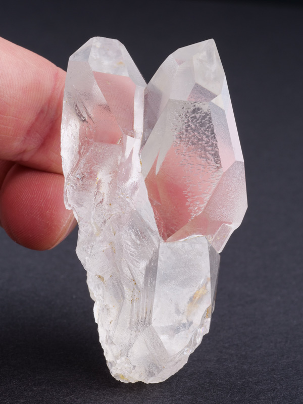 Krásně tvarovaný velmi čistý dvojkrystal křišťálu. Čistota a vysoký lesk jsou to co dělají tento vzorek zajímavým. Velmi estetická srostlice s jen drobným setřením hran.
