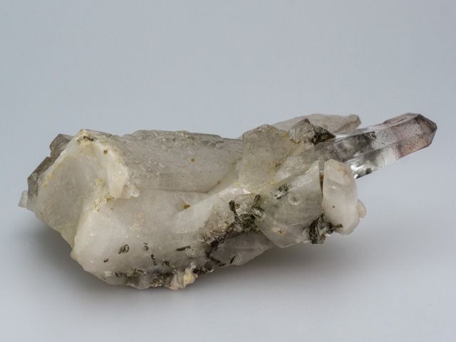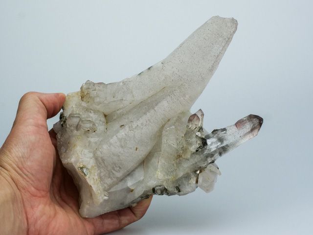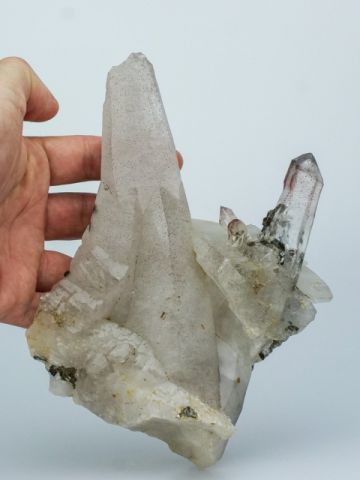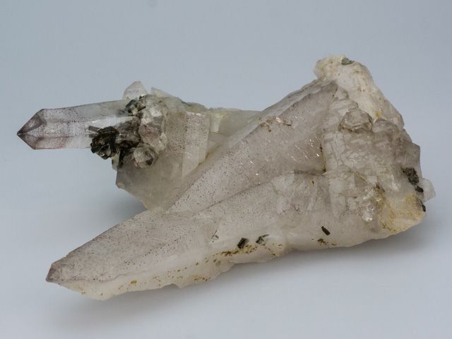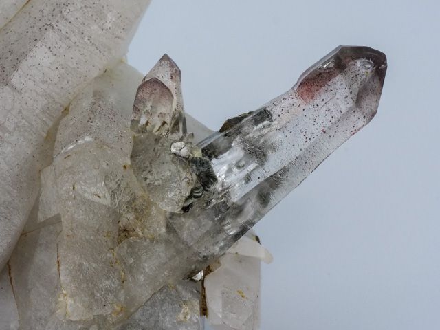 Velká drúza krystalů křemene. Vzorek má příjemnou šedohnědou barvu a vysoký lesk. Menší z krystalů mají vysokou čistotu. Poškození je v kontrastu velikosti vzorku minimální (jeden z menších krystalů byl odlomen v kontaktu se slídou). Těsně pod povrchem krystalů jsou drobné inkluze červeného blíže neurčeného minerálu.