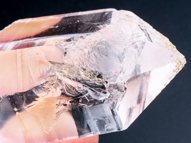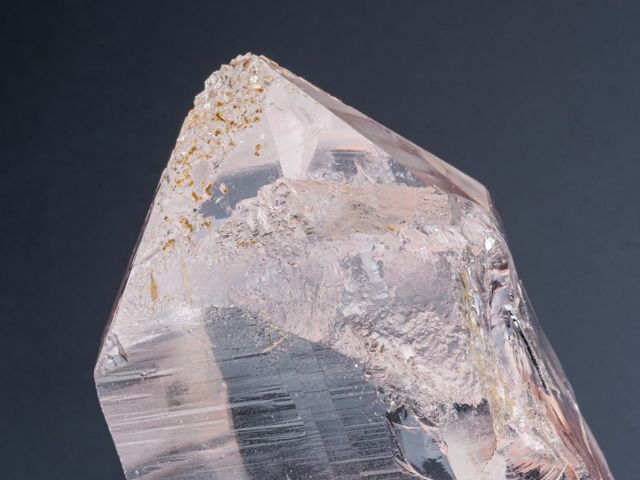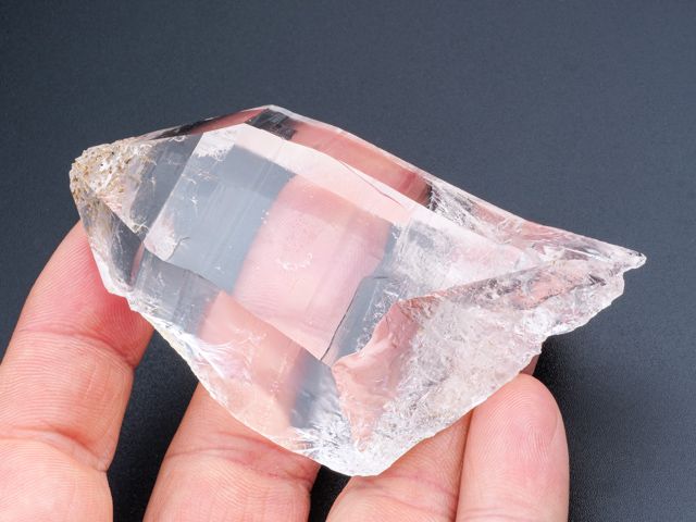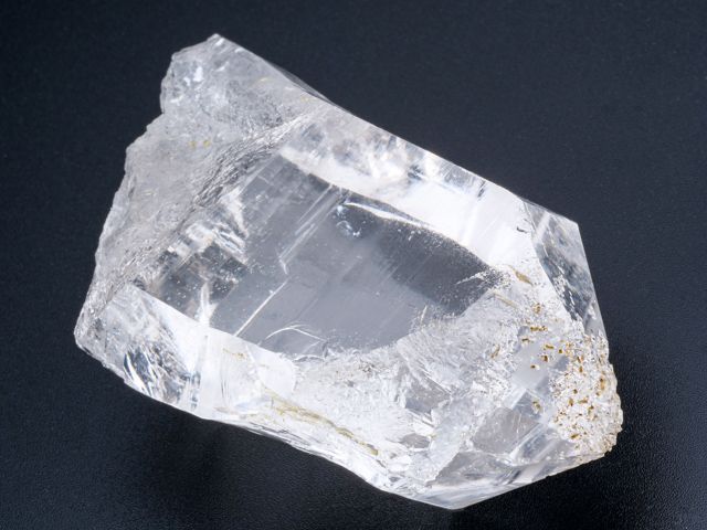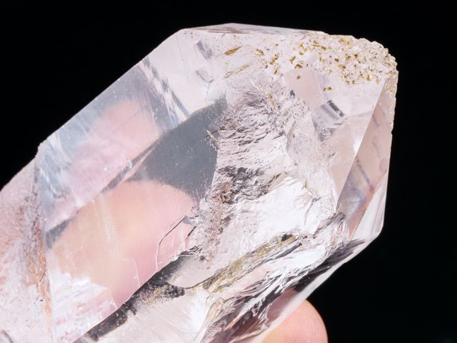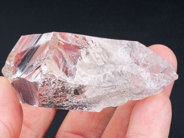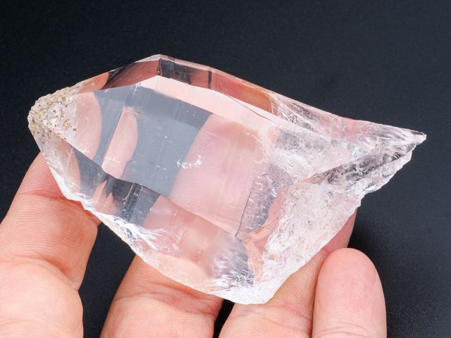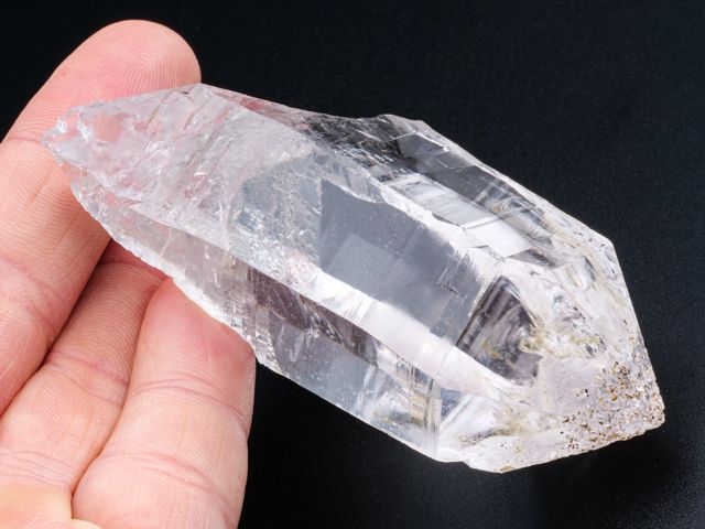 Velmi čistý krystal křišťálu z Afriky. Čistota a vysoký lesk jsou to co dělají tento vzorek zajímavým. Ukončený krystal má drobná poškození na hranách prizmatu (největší 20x10 mm). V kontrastu velikosti a kvality je tento vzorek velmi zajímavý i přes toto poškození a cena je díky tomu upravena a snížena na cenu suroviny.