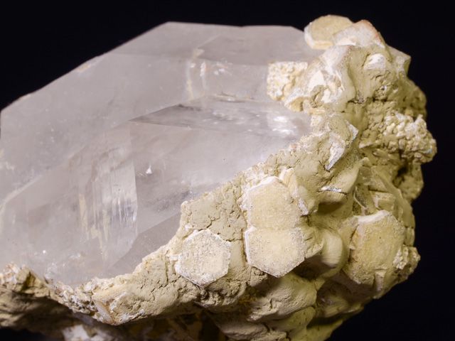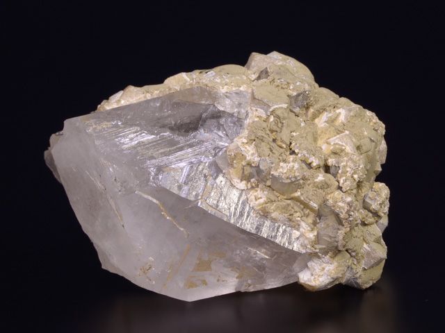 This cabinet sized specimen is nice because it features apatites perched on an unusually pristine, and very impressive, quartz crystals.This cabinet sized specimen is nice because it features apatites perched on an unusually pristine, and very impressive, quartz crystals. Apatite crystals are white up to 10 mm. The quartz is covered with siderite crystals.