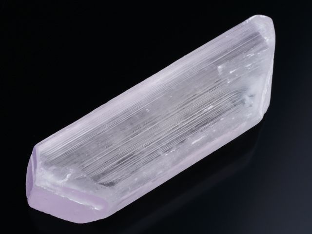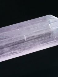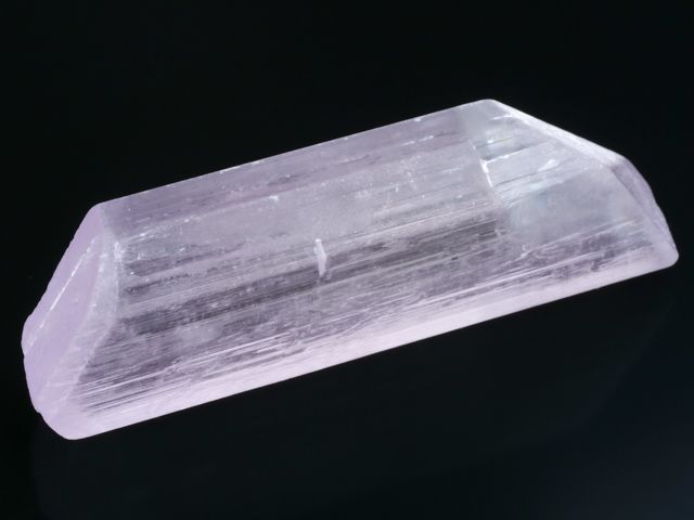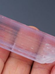 Hezký oboustranně ukončený krystal velmi jemně růžového kunzitu z provincie Nuristan. Krystal má lehký nádech růžové barvy, má luxusní ukončení na obou stranách a velmi vysokou čistotu. Kámen má hedvábný lesk.