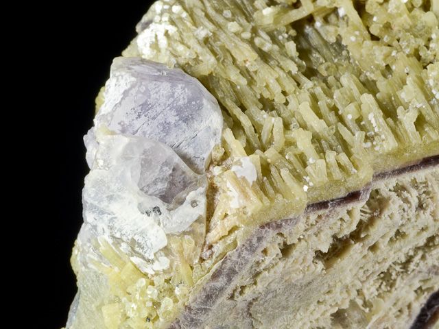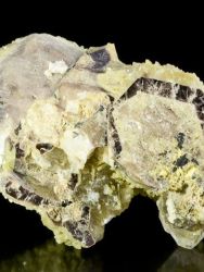 A group of interconnected two generational Lepidolite crystals, smoky quartz and interesting apatite crystal.A group of interconnected two generational Lepidolite crystals, smoky quartz and interesting apatite crystal. The first generation crystals are a shiny dark lilac color. 27 mm wide crystal of light apatite well centered on matrix of smoky quartz and lepidolite. The specimen is in excellent condition on both the top, the bottom and the two sides with cleavage planes on the end of the specimen.