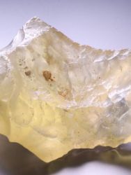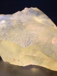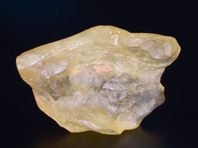 Between the towering dunes of the Eastern Great Sand Sea of Egypt are long narrow gaps where bedrock is exposed. Libyan desert glass is generally yellow in color. It can be very clear or it can be a milky, even bubbly light yellow. Some fragments have dark bands and swirls of brownish material. It is in these dark areas that some of the melted comic body is believed by some to be preserved. Libyan Desert Glass was used in ancient times as a gem stone for the Pharaohs and remains a highly prized impact glass for collectors today.