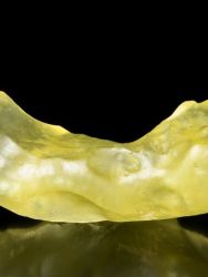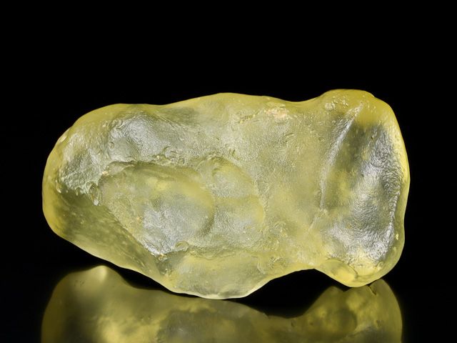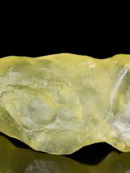 Between the towering dunes of the Eastern Great Sand Sea of Egypt are long narrow gaps where bedrock is exposed. Libyan desert glass is generally yellow in color. It can be very clear or it can be a milky, even bubbly light yellow. Some fragments have dark bands and swirls of brownish material. It is in these dark areas that some of the melted comic body is believed by some to be preserved. Libyan Desert Glass was used in ancient times as a gem stone for the Pharaohs and remains a highly prized impact glass for collectors today.