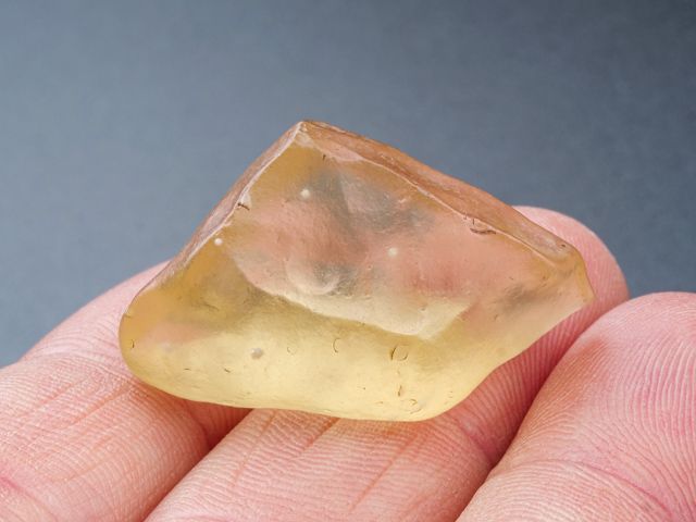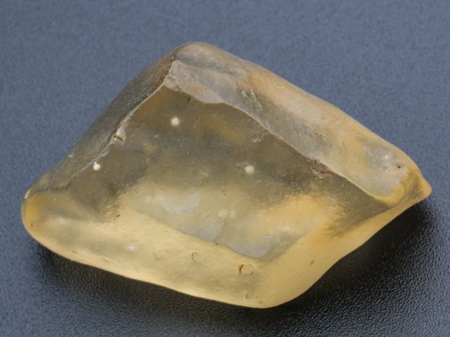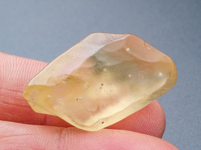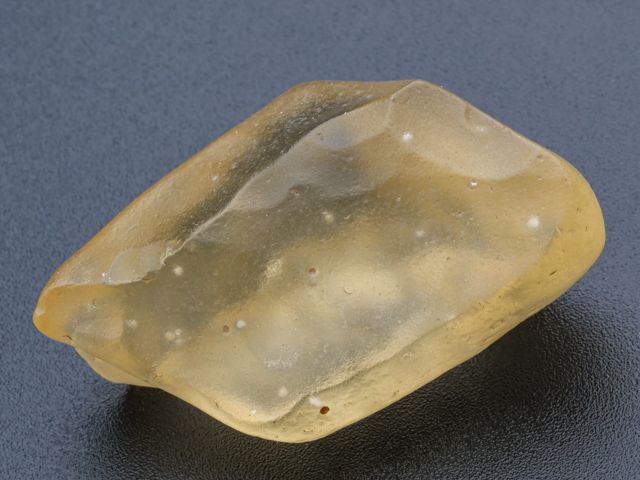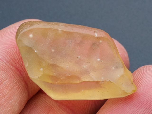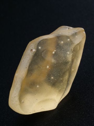 Žlutě zbarvené a transparentní Libyjské sklo o váze 8,8 g. Kámen je bez poškození, zajímavě lesklý a velice kvalitní. Povrch kamene je pokryt regmaglypty - malé prohlubně na povrchu vzorku. Nadprůměrný vzorek!