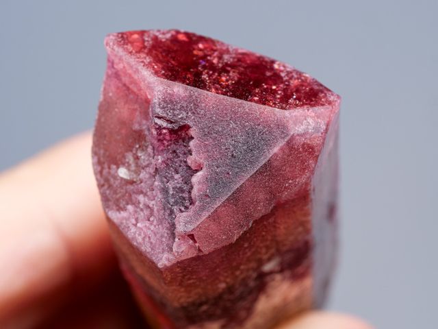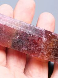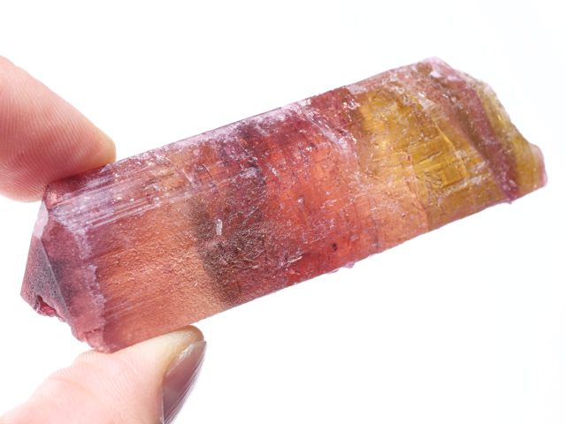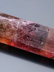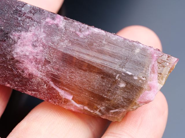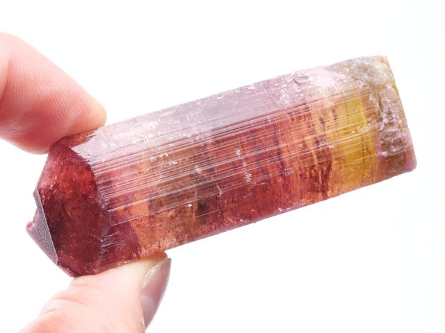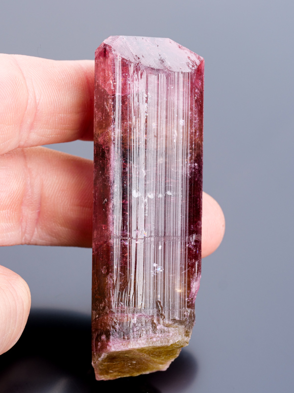 Krásný ukončený krystal liddicoatitu z famózní lokality Malkhan. Jedná se o turmalín liddicoatit-elbaitové řady z pegmatitů Sibiře. Lesklý krystal zajímavých barev. Vzorek je bez poškození, ale na dvou místech byl profesionálně slepen a stabilizován. Toto není na první pohled vůbec poznat a je to zahrnuto do výsledné ceny.