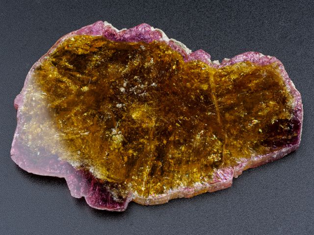 Barevně jedinečný řez ruským turmalínem (liddiocoatitem). Liddiocoatity jako je tento jsou světoznámě proslulé a vzhledem k jejich extravagantní barevnosti jsou využívány do jedinečných šperků. Placička může být i kvalitním zástupcem tohoto minerálu ve Vaší sbírce. Řez je leštěn z obou stran.