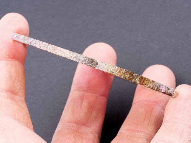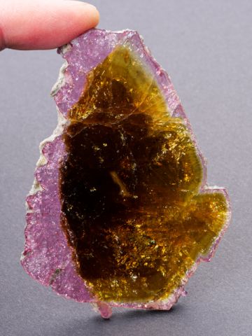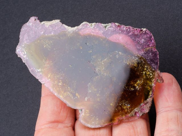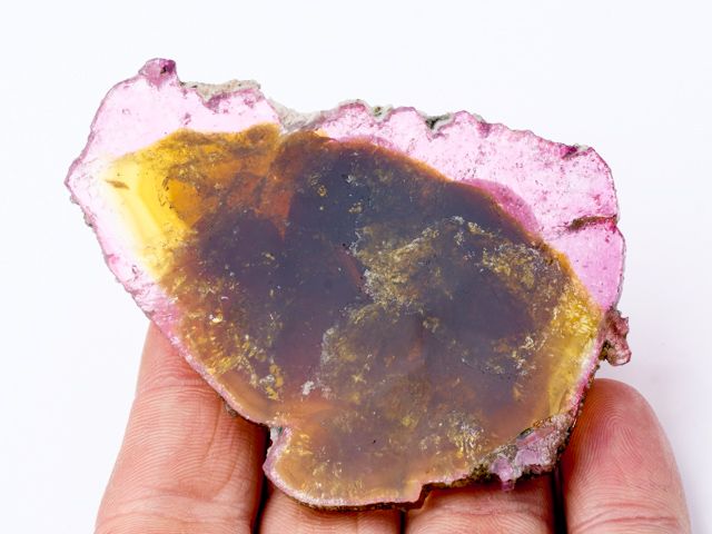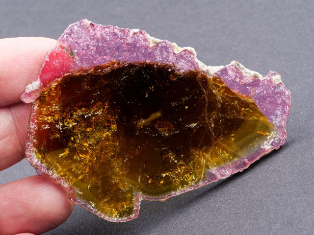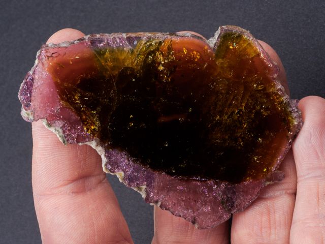 Barevně jedinečný řez ruským turmalínem (liddicoatitem). Liddiocoatity jako je tento jsou světoznámě proslulé a vzhledem k jejich extravagantní barevnosti jsou využívány do jedinečných šperků. Placička může být i kvalitním zástupcem tohoto minerálu ve Vaší sbírce. Řez je leštěn z obou stran.