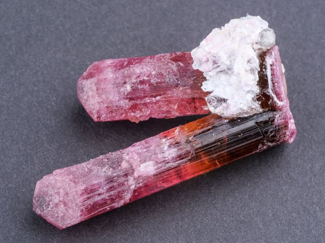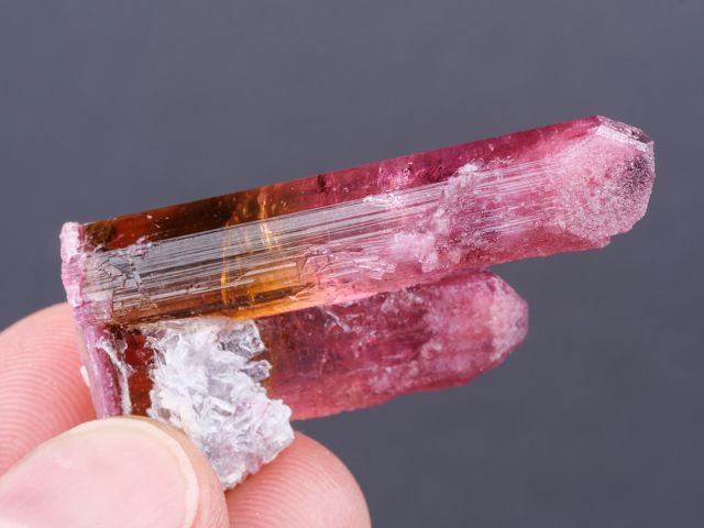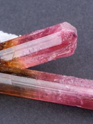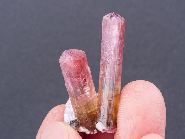 Vzorek srostlice turmalínu - 2 krystaly liddiocoatitu spojené s drobnou lepidolitovou podložkou a krystalem záhnědy z lokality Malkhan (pegmatit Sousedka).Vzorek srostlice turmalínu - 2 krystaly liddiocoatitu spojené s drobnou lepidolitovou podložkou a krystalem záhnědy z lokality Malkhan (pegmatit Sousedka). Hlavní (větší) krystal měří 3,9 cm s růžovým ukončením je o něco málo čistší než druhý ukončený turmalín o velikosti 3,0 cm. Tyto srostlice bez poškození a oprav jsou pro lokalitu velmi ceněny (drtivá většina krystalů je z podložkových vzorků odlomen přirozeně mrazem nebo při těžbě). Jedná se o opravdu estetický ukončený vzorek výrazně lesklého turmalínu s typický tvarem a velmi ostrým ukončením. Barvy na denním světle nemusí odpovídat barevnému provedení fotografií pořízených při studiovém osvětlení. Skvělý vzorek do skvělé sbírky!